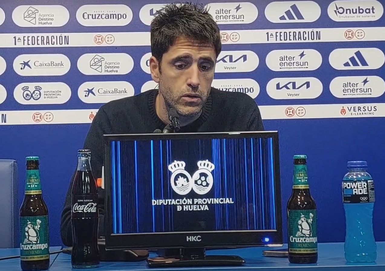 El entrenador albiazul, llegó cariacontecido a la sala de prensa del Nuevo Colombino, tras la derrota accidentada de su equipo ante el filial verdiblanco.