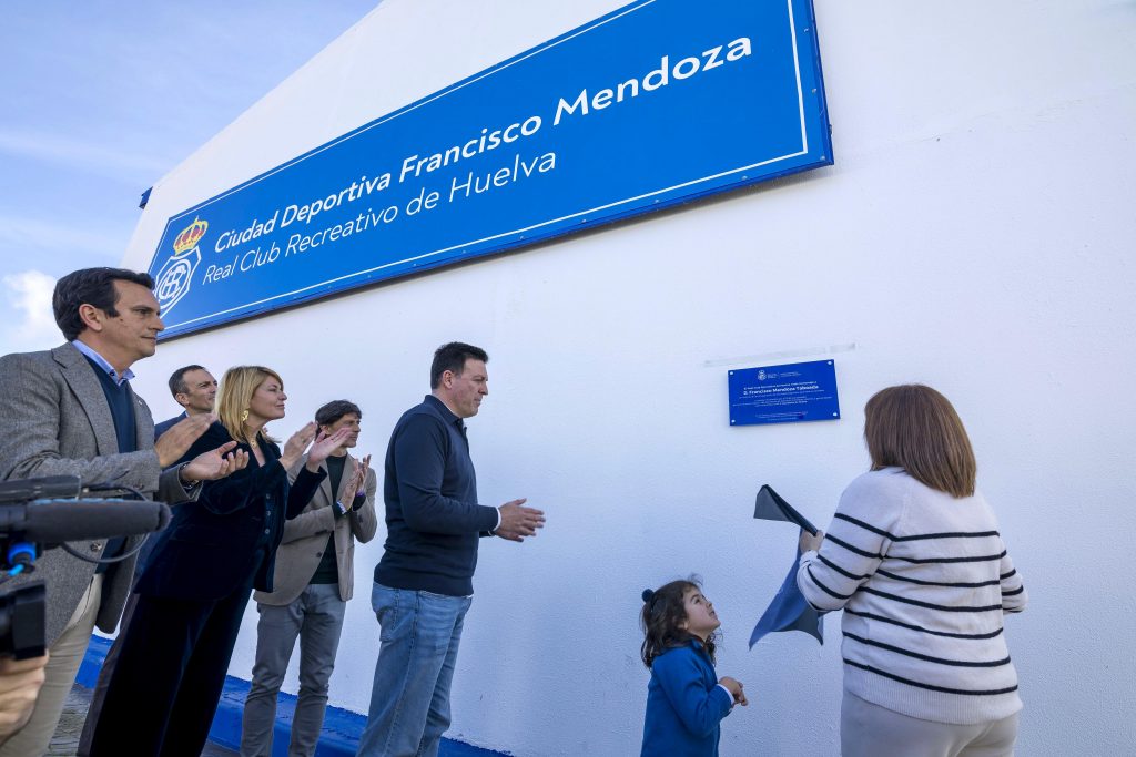 La Ciudad Deportiva del Recreativo de Huelva ya luce rotulada como Francisco Mendoza Taboada, expresidente y directivo del Decano durante más de una década. La alcaldesa de Huelva, Pilar Miranda, y su equipo, acompañada por el consejo de administración, la familia de Francisco Mendoza Taboada, miembros de la cantera y primer equipo, así como antiguos compañeros del expresidente albiazul, colaboradores y peñistas han inaugurado hoy la nueva rotulación de la instalación. De este modo se rinde homenaje a quien fue su gran impulsor, el presidente que apostó por dotar al club de unas instalaciones propias para el primer equipo y la cantera. Junto al nombre en el edificio principal, una placa en la zona de acceso al campo Antonio Toledo recuerda a Francisco Mendoza como “un luchador incansable por el club que presidió, encarnó los valores de esfuerzo, humildad, valentía y generosidad que caracterizan al Real Club Recreativo de Huelva”.