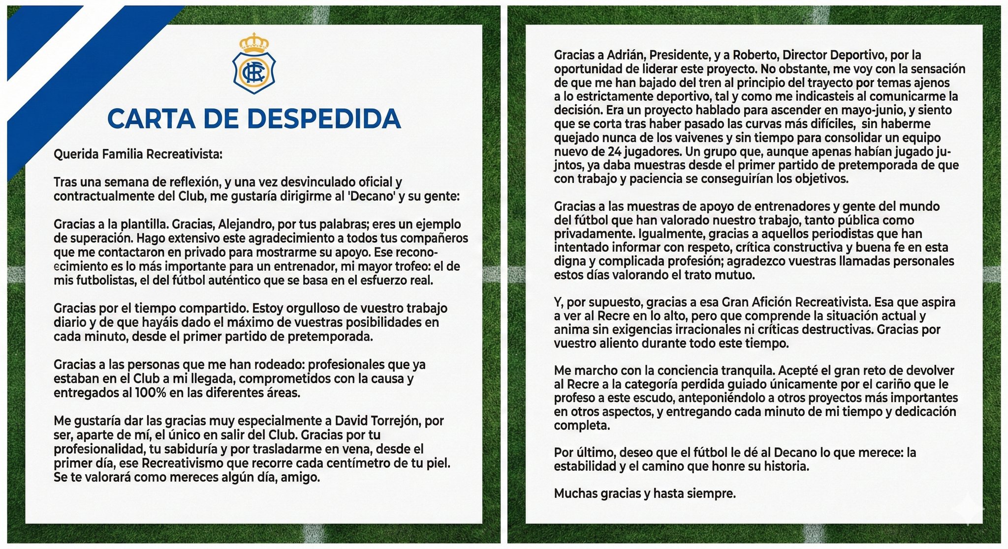 El exentrenador del Decano, Pedro Morilla, ha publicado una carta de despedida de la entidad albiazul en la que desvela varias aristas de su destitución, que la argumenta por motivos «extradeportivos» como delata de la conversación con los rectores albiazules cuando le comunicaron el cese «Me han bajado de un tren al prinicipio del trayecto por temas ajenos a lo estrictamente deportivo» indica.